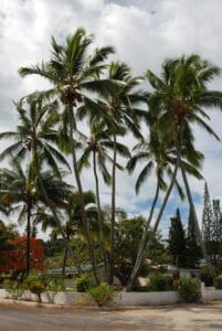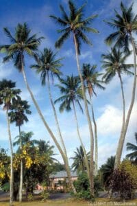 On Rarotonga there are seven Coconut Palms in a cluster, one surrounded by six others, about 50metres east of the roundabout in Avarua. It is sometimes claimed that these palms developed from a single seednut brought from an outer island in the early 1900s, and planted in the grounds of the Administration Building. That building became the Courthouse that was destroyed by fire in 1992.