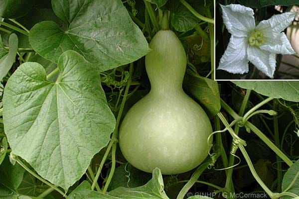 The Bottle Gourd (Lagenaria siceraria) is a large-leaved climbing vine that grows in well-aerated volcanic soils, in sunny areas with moderate rainfall. It has a large fruit, that is typically flask-shaped. The mature fruit has a very hard, thin shell, traditionally used in Africa, Asia, the Americas, and parts of Polynesia, to make a wide range of utensils.