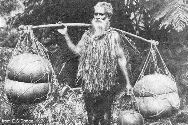 It was previously thought that the Bottle Gourd was anciently present throughout all of Polynesia, having been introduced by the early Polynesians and their ancestors from Indonesia or thereabouts. However, a recent re-investigation by Whistler (1990) showed that there was no evidence of the Bottle Gourd being anciently in Fiji, Samoa or Tonga. He reinterpreted the ‘evidence’ as being a misidentification of the fruit of the anciently introduced Wax Gourd(Benincasa hispida), a related plant originating in Asia.