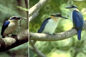 Mangaia, nearly the same size as Rarotonga, has eroded volcanic hills in the centre surrounded by a kilometre-wide limestone palisade – a raised-reef – reaching 60m elevation and supporting a healthy tropical forest. The fossil record shows that Mangaia had 13 resident landbirds, of which only five have survived, including the Mangaia Kingfisher (Tanga‘eo), a single-island endemic. We treat this rufous-collared kingfisher as a separate species, although some taxonomists have it as a subspecies of the more widespread Chattering Kingfisher.