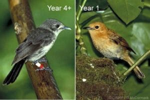 During 1996 Camilla Baker, and other students from Oxford University, supported by the Heritage Project, estimated the numbers of birds on Mangaia using a different method to the Rowe team, and carried out detailed vegetation and rat surveys. Although their conclusions on the distribution of kingfishers showed significant differences, their population estimate of 400 to 700 birds, supported the earlier work. They also estimated that there were 9,000 (± 1,000) Mynas on the island.