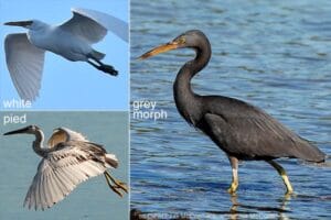 Other herons are pure white and this is thought to be an advantage on limestone sands and these are in moderate numbers on Ātiu. However, the genetics of heron colour is not as simple as “you’re dark grey” or “you’re pure white”. Although rare, there are pied or mixed-colour birds which vary of nearly all grey to nearly all white.