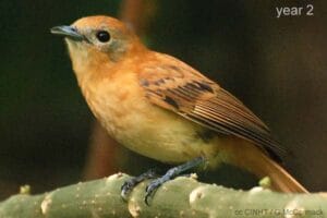 In August 2008 two nests were found. The photo shows the parents coaxing one of their two nestlings out of the nest. After it climbed onto the branch it was knocked to the ground by mynas and this led to an ongoing project to reduce or eradicate mynas on Ātiu.